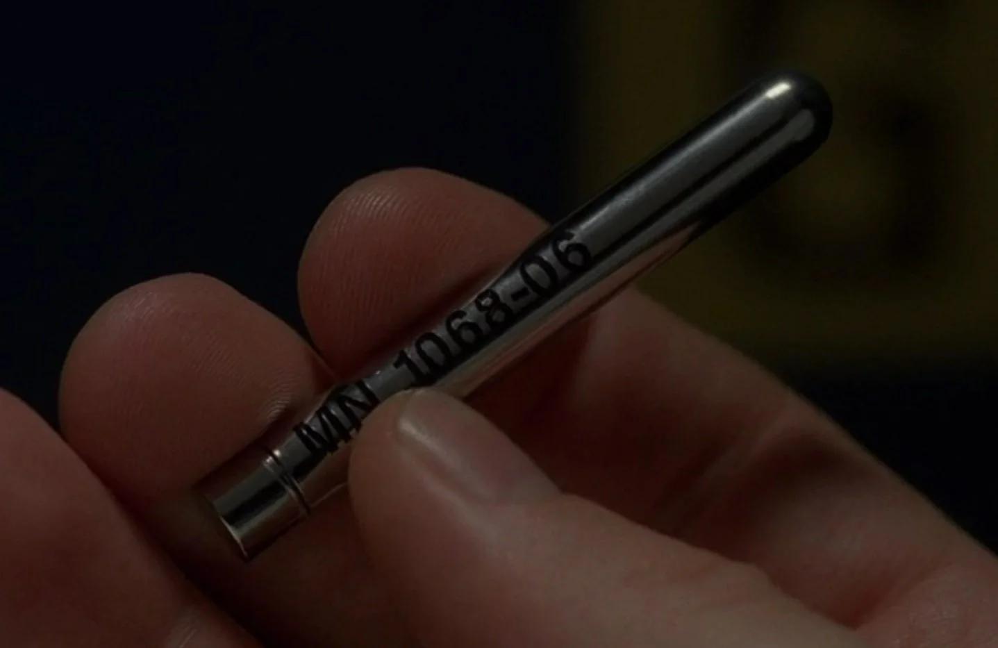 Item information: Mulder finds a new chip / replacement chip for Scully stored in this vial. This prop replica was also made for Brian Terranova. I made a drawing and created a 3D file, in this case the simplest design for a prop replica that I’ve ever done. Brian had found a machinist and graphic artist in the US and Canada who manufactured it based on my files. The vial was machined by "Dark Energy Creations", whereas the letters on the vial were made by graphic designer Justin Monk. The letters were applied onto the vial by Brian himself. He was very pleased with the results.